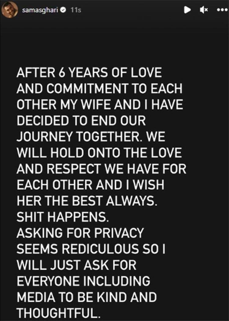 “Altı yıllık sevgi ve bağlılığın ardından eşim ve ben ilişkimizi bitirmeye karar verdik. Birbirimize karşı hep sevgi ve saygı duyacağız.”