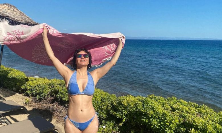 51 yaşında olan Göksel, Instagram hesabından, mavi mayolu fotoğraflarını 'Yaz, dondurma, kedi ve ben' notuyla paylaştı.