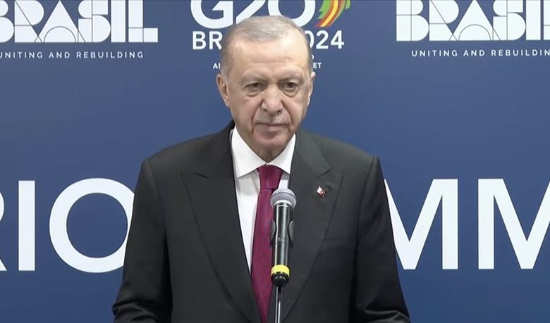 Cumhurbaşkanı Recep Tayyip Erdoğan, G20 Liderler Zirvesi’nde basın toplantısı düzenleyerek, “Tüm insanlığın vicdanını sızlatan savaşlarda uluslararası kuruluşların iflasına tanıklık ediyoruz” dedi. Dezenflasyon süreci 2024 Haziran ayında başladığını dile getiren Erdoğan, sürecin 2025 yılında da devam edeceğini belirtti. Erdoğan, “Bölgemizdeki çatışmalar ve krizler çözüme kavuştukça Türk ekonomisindeki iyileşme daha da hızlanacak, Türkiye, hedeflerine doğru koşar adımlarla gidecektir” ifadelerini kullandı.