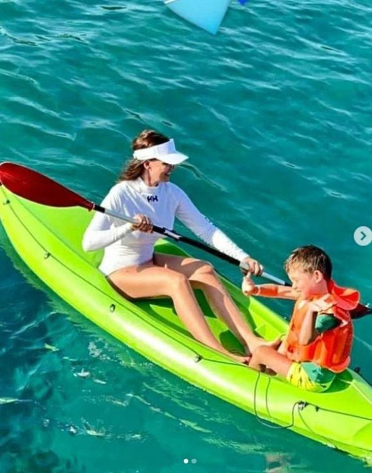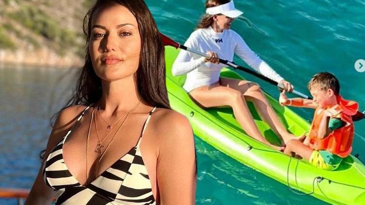 Ama Fahriye Evcen çocukları ile tatile devam ediyor. Dün büyük oğlu Karan’ı Göcek koylarında kanoyla gezdirdi.