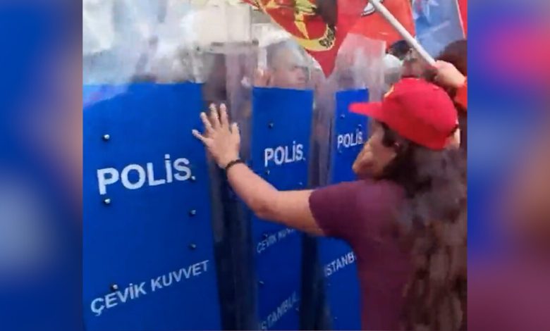 Geniş güvenlik önlemi alan polislere hakaret eden grup bununla kalmadı ve polis ekiplerine saldırdı.