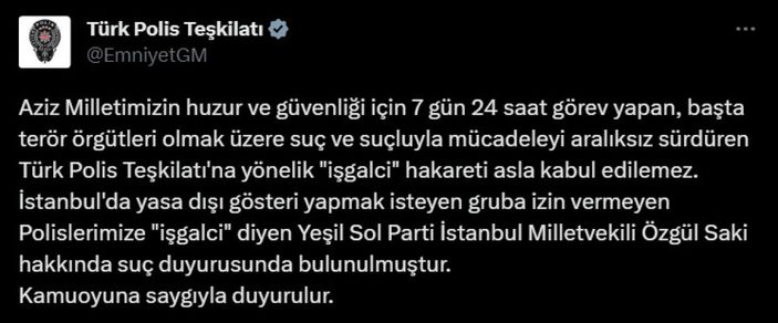 İstanbul'da yasa dışı gösteri yapmak isteyen gruba izin vermeyen Polislerimize "işgalci" diyen HDP İstanbul Milletvekili Özgül Saki hakkında suç duyurusunda bulunulmuştur.